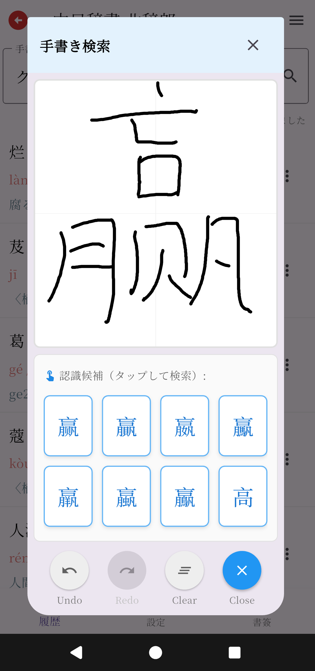手書き検索では、手書きした漢字を認識し、漢字の検索を行うことができます。発音が分からなくても検索できますし、筆順が違っても、少し間違っていても大丈夫です。