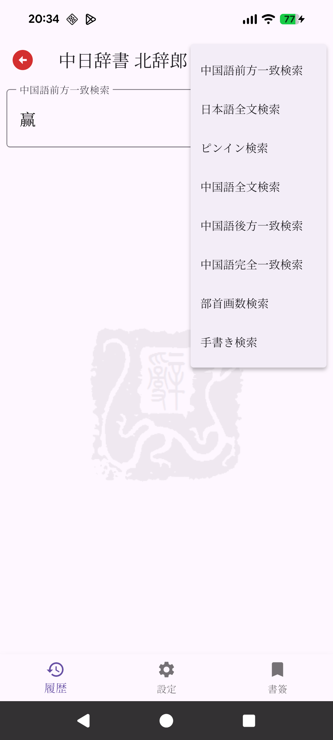 画面右上のオプションボタンから検索方法を選択できます。中国語の前方一致、後方一致、全文検索、完全一致、日本語全文検索、ピンイン検索、部首画数検索、手書き検索からお選びください。
