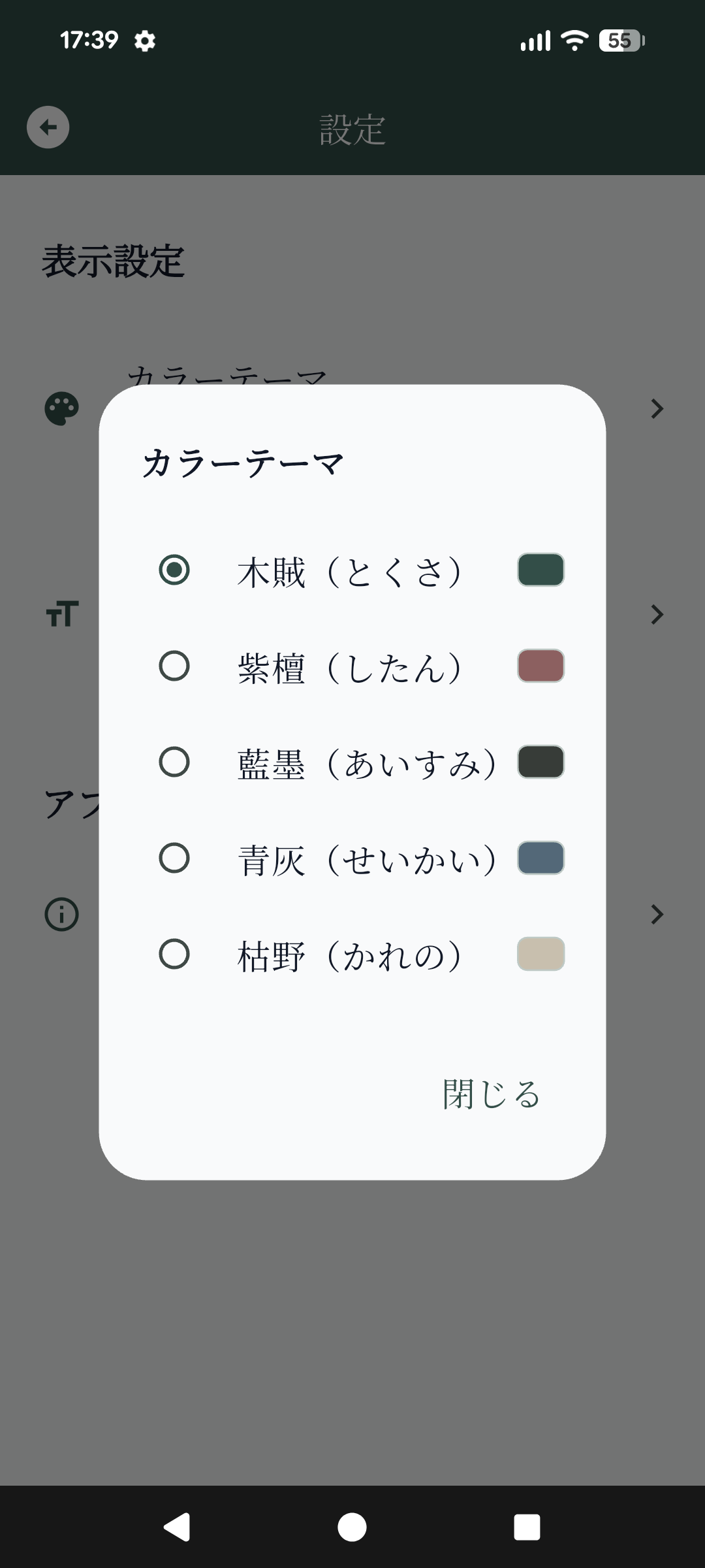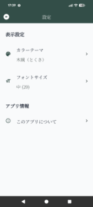 設定画面ではカラーテーマを選択できるほか、フォントサイズを変更することができます。「このアプリについて」をタップするとアプリの情報が表示されます。