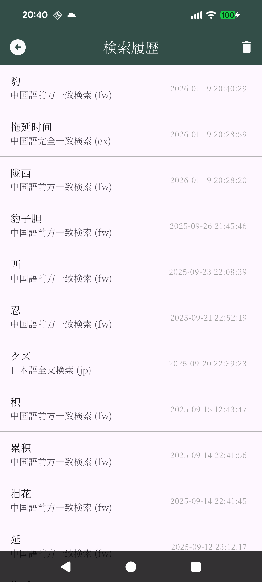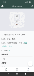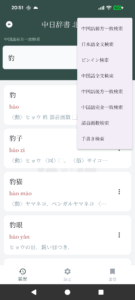 検索語句を入力し、検索を実行すると、デフォルトでは「中国語前方一致検索」が行われます。検索結果のリストをタップすると「詳細画面」に移動します。