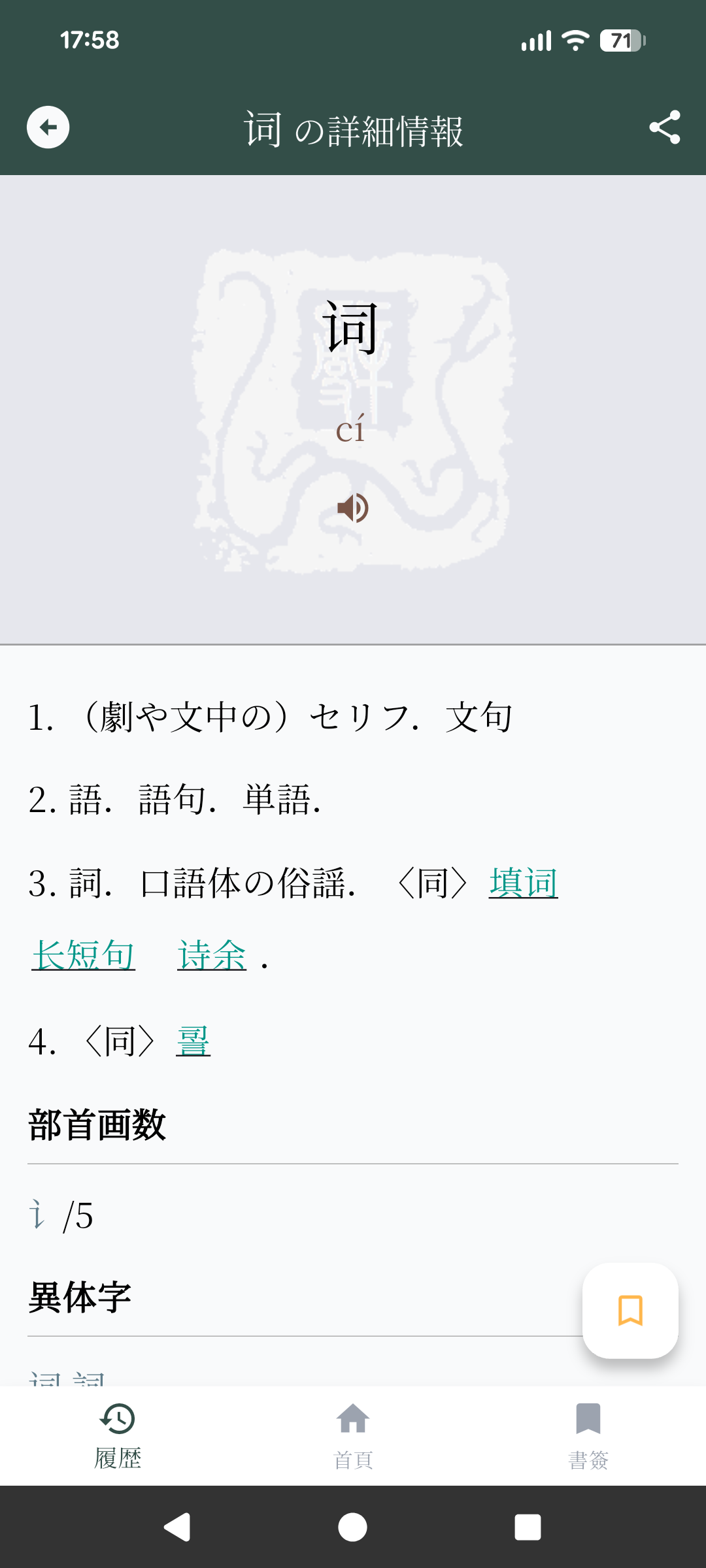 画面右下に浮いているブックマークボタンをタップすると、現在表示されている単語をブックマークできます。ブックマークボタンを再度タップすると、ブックマークが解除されます。ブックマークは50件まで保存することができ、画面右下の「書簽」メニューをタップするとブックマークを確認できます。