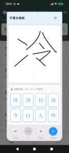 手書き検索では、手書きした漢字を認識し、漢字の検索を行うことができます。発音が分からなくても検索できますし、筆順が違っても、少し間違っていても大丈夫です。