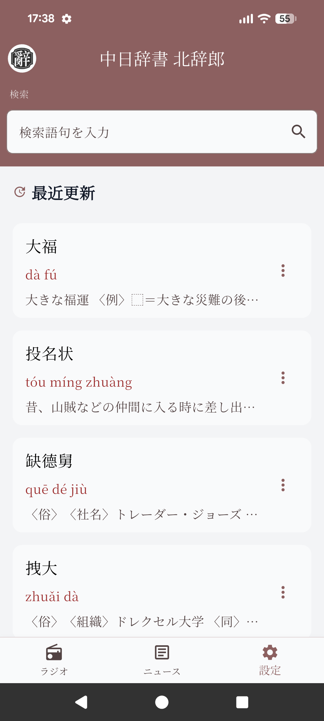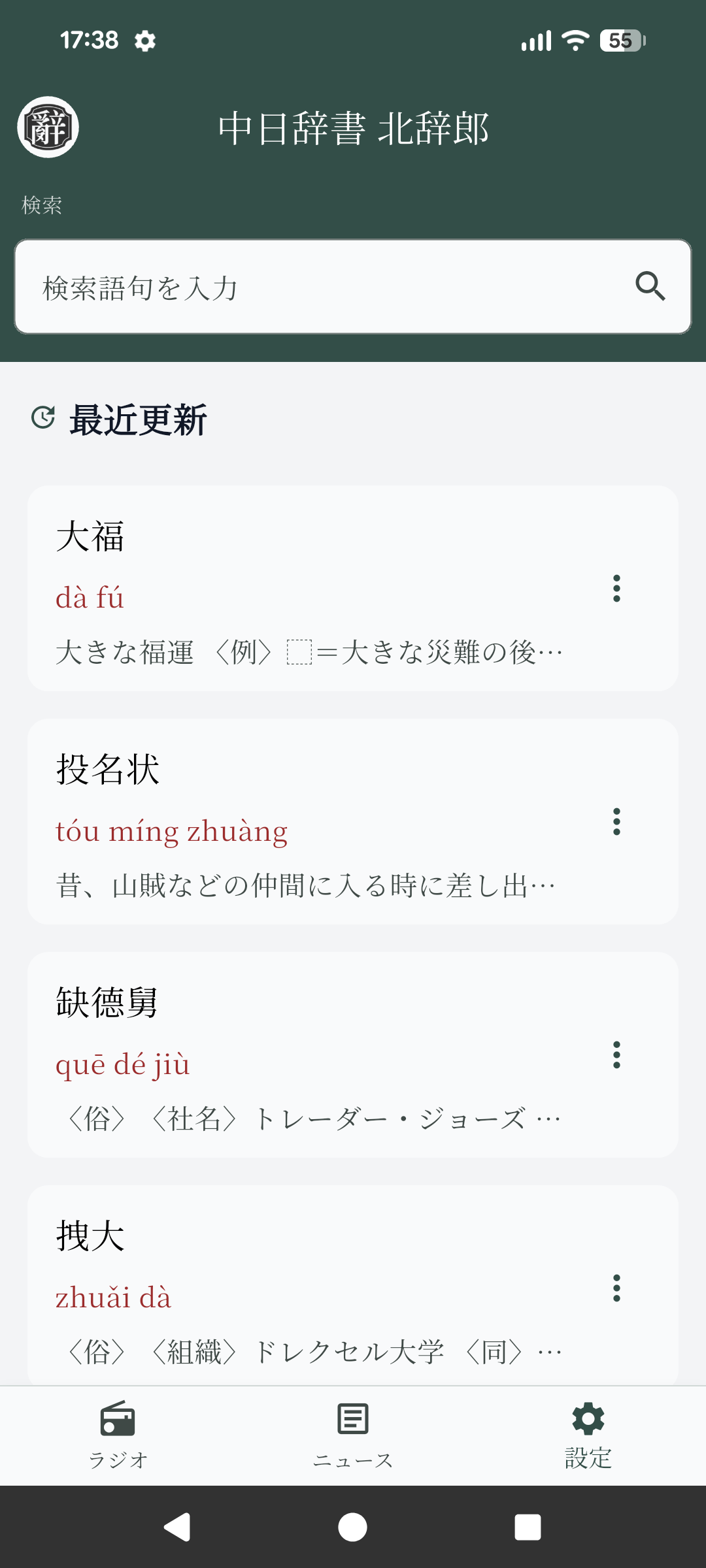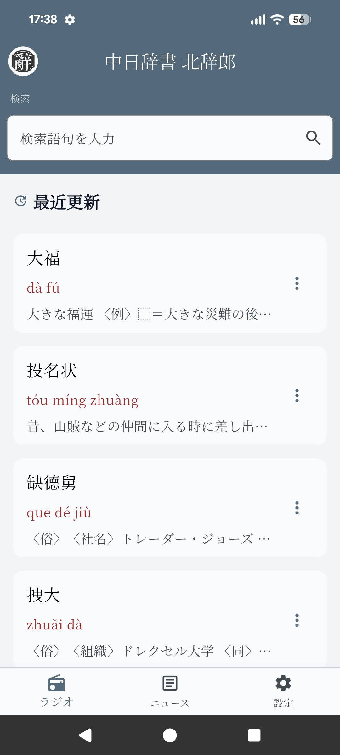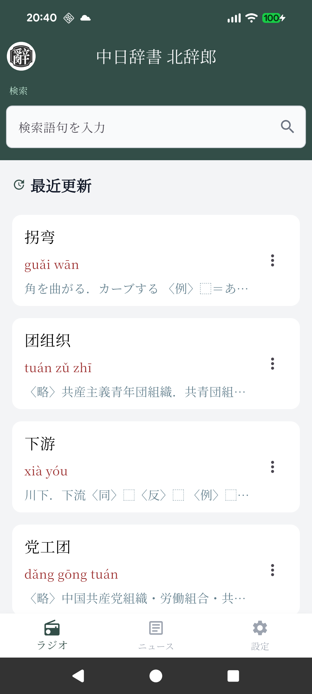 北辞郎のホーム画面です。検索ボックスに言葉を入力し、検索すると結果が一覧表示されます。画面下のメニューからは「ラジオ聴取画面」、「ニュース閲覧画面」、「設定画面」に移動できます。