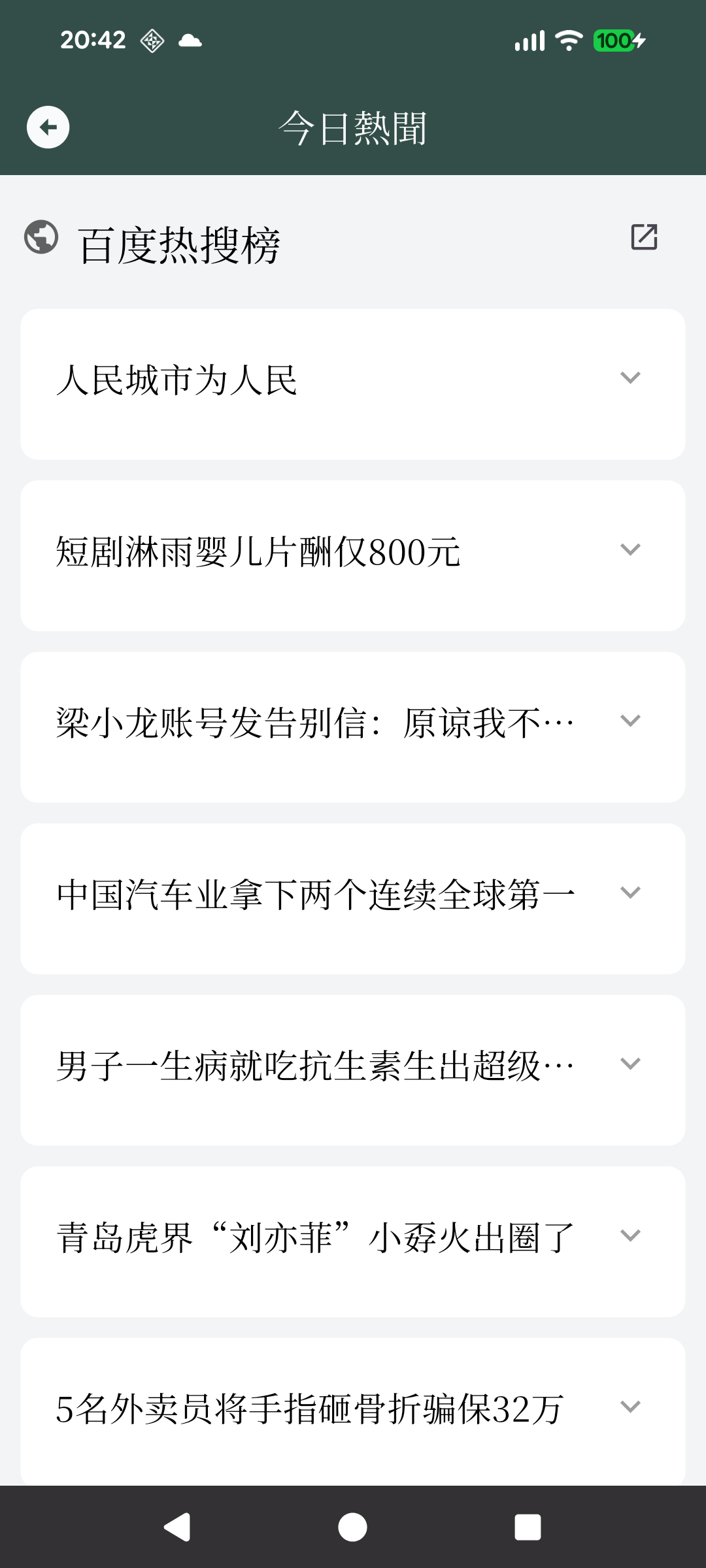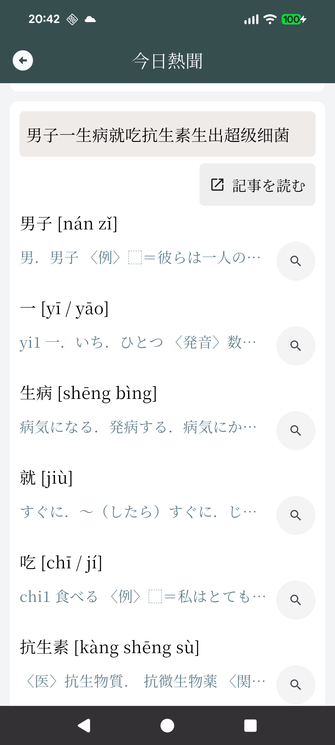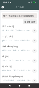 「今日熱聞」は中国で今話題になっているニュースをチェックする機能です。ニュースの見出し一覧が表示され、タップすると見出しに含まれる単語の意味を確認することができます。