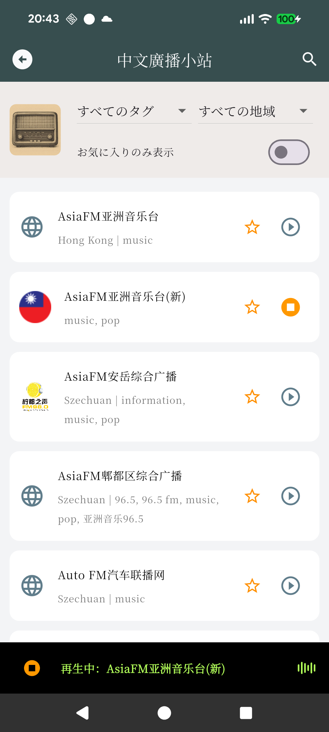 バックグラウンド再生に対応しているため、北辞郎アプリから離れてもラジオを聴き続けることが可能です。地名、タグによる絞り込みのほか、右上の虫めがねアイコンをクリックすると検索でチャンネルが絞り込まれます。リストに表示されている☆をタップするとお気に入りに登録されます。