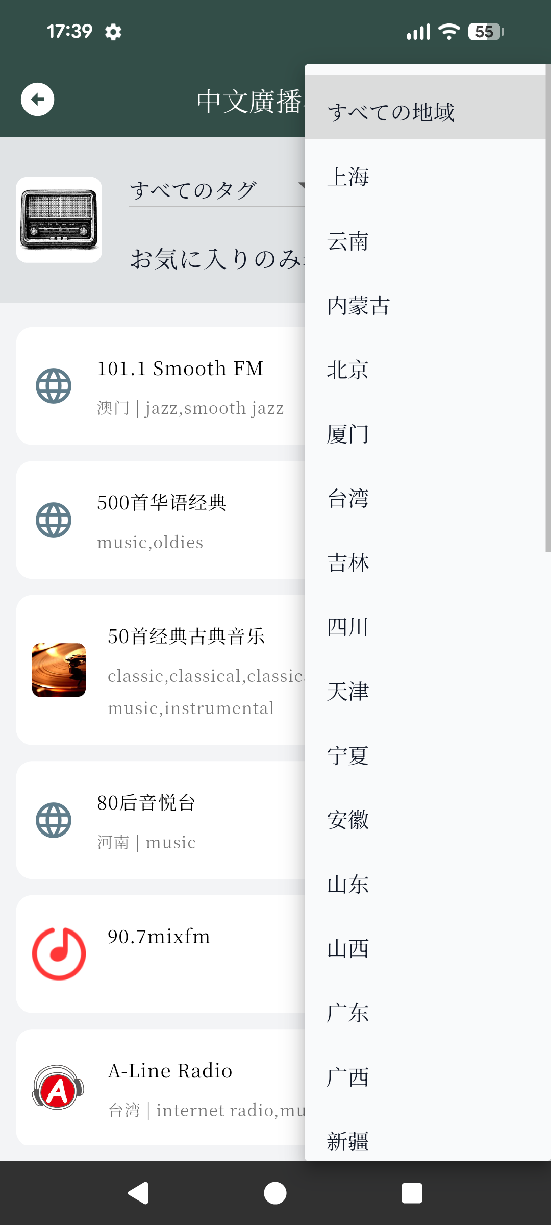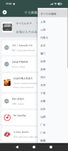 トップ画面下部の「ラジオ」をタップすると中華圏のラジオ局一覧が表示され、1000を超えるチャンネルのラジオを聴取することができます。大都市のラジオ局だけでなく、さまざまな地方のローカル局の放送、少数民族向けのコンテンツも楽しめます。以下のように地方による絞り込みも可能です。