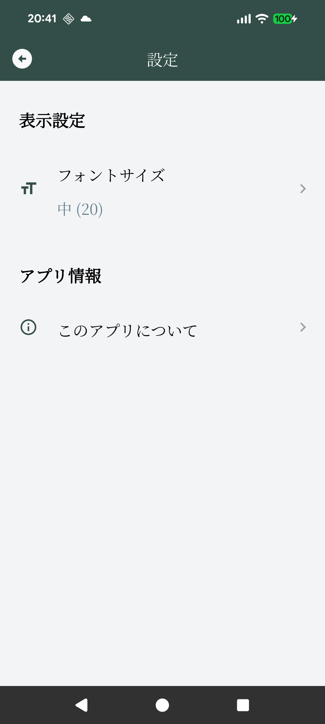 設定画面ではフォントサイズを変更することができます。「このアプリについて」をタップするとアプリの情報が表示されます。
